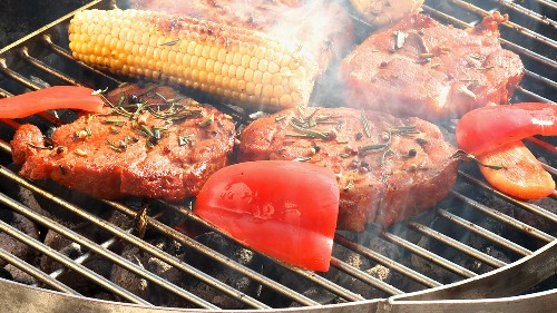 Pork neck steaks with corn on the cob & peppers on barbecue